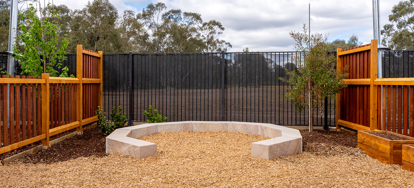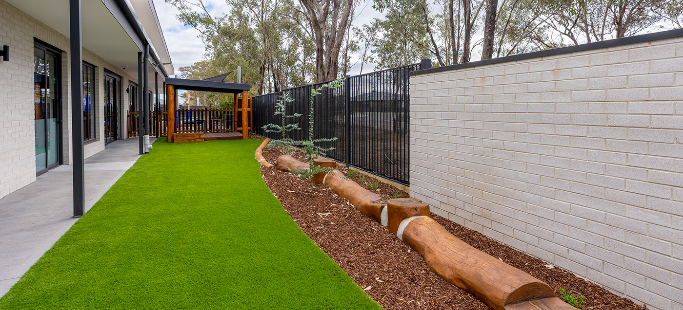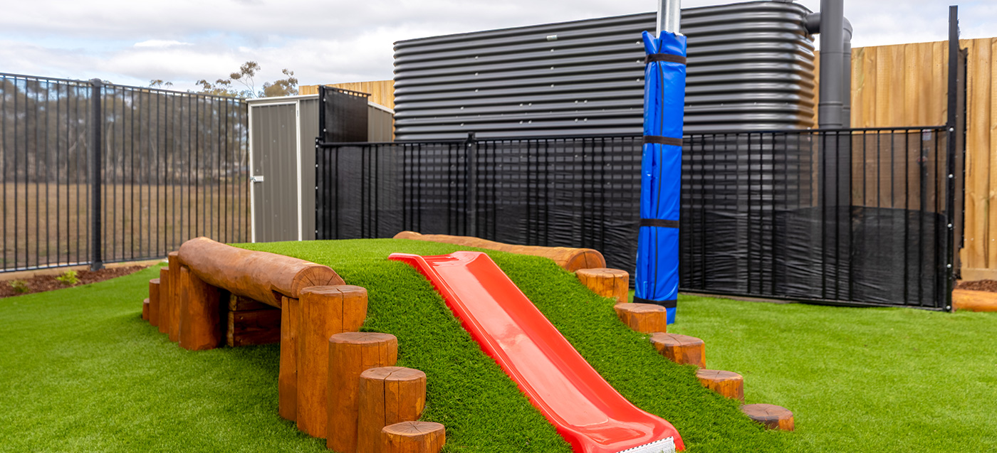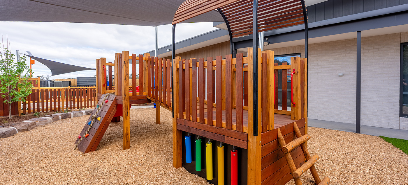 A purpose-built childcare playground at Huntly Viewpoint with integrated landscape and play elements. Delivered by specialist childcare landscapers. Designed for early learning environments.
