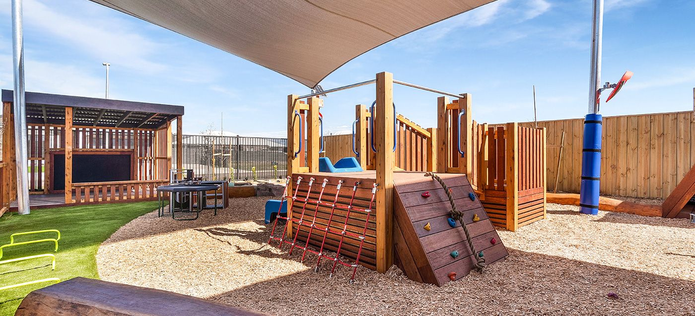 A purpose-built childcare playground at Huntly Viewpoint with integrated landscape and play elements. Delivered by specialist childcare landscapers. Designed for early learning…